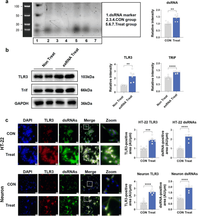 四川大學(xué)華西醫(yī)院、法國(guó)巴黎薩克雷大學(xué)、美國(guó)約翰・霍普金斯大學(xué)的科研團(tuán)隊(duì)在上述文章中探究了慢性神經(jīng)病理性疼痛(由神經(jīng)原發(fā)性損傷引發(fā))造成的認(rèn)知障礙(如記憶下降、執(zhí)行功能受損)的分子機(jī)制。實(shí)驗(yàn)人員建立了小鼠坐骨神經(jīng)慢性壓迫損傷(CCI)模型,發(fā)現(xiàn)在CCI引起的慢性疼痛過(guò)程中施萬(wàn)細(xì)胞會(huì)釋放 exRNAs(尤其是 dsRNAs),這些 dsRNAs 通過(guò)外周-中樞通訊(如血液循環(huán)、囊泡載體)到達(dá)海馬,與神經(jīng)元上的 TLR3 結(jié)合,激活下游 TRIF/RIP3/MLKL 炎癥通路和凋亡通路,損傷海馬突觸可塑性(樹(shù)突棘密度降低、突觸蛋白 PSD95 和 SYN 表達(dá)下降),最終導(dǎo)致認(rèn)知障礙。由AbMole提供的Capsaicin(辣椒素,AbMole,M3422)在本文中作為誘導(dǎo)細(xì)胞慢性疼痛的造模劑,被實(shí)驗(yàn)人員用于處理施萬(wàn)細(xì)胞,以驗(yàn)證上述機(jī)制[20]