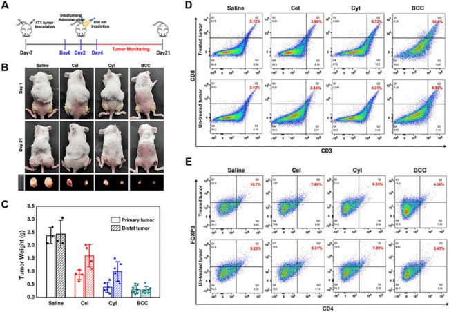 青島大學(xué)的科研人員在上述文章中開(kāi)發(fā)了一種無(wú)載體納米系統(tǒng)(BCC)作為腫瘤的原位疫苗,其主要成分為抗腫瘤化合物Celastrol(雷公藤紅素,Tripterine)和光熱劑CyI。BCC可在近紅外(NIR)照射下產(chǎn)生熱量,加速生物活性物質(zhì)Celastrol 的釋放,并通過(guò)Celastrol 和光熱誘導(dǎo)免疫原性細(xì)胞死亡,激活樹(shù)突狀細(xì)胞(DCs)的成熟,招募細(xì)胞毒性T淋巴細(xì)胞(CTLs),減少免疫抑制細(xì)胞(如MDSCs、Tregs),重塑腫瘤免疫微環(huán)境;在小鼠模型中,BCC不僅抑制原發(fā)腫瘤,還能通過(guò)長(zhǎng)期免疫記憶抑制遠(yuǎn)端腫瘤生長(zhǎng)和肺轉(zhuǎn)移,且生物安全性良好[29]。在實(shí)驗(yàn)中,科研人員使用了由AbMole提供的雷公藤紅素(Celastrol,Tripterine,AbMole,M3884)。