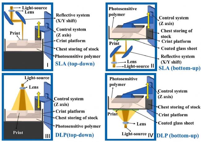 光固化技術(shù)的核心機(jī)制是通過特定波長(365-405nm)光源照射光敏聚合物(由單體、低聚物、光引發(fā)劑組成),引發(fā)聚合固化,再通過打印平臺沿Z軸分層堆疊形成三維結(jié)構(gòu),工作原理如下圖所示。