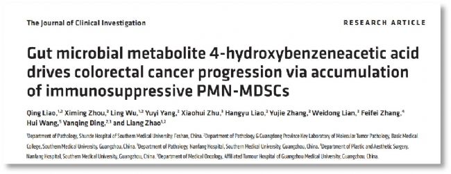 文章題目為“Gut microbial metabolite 4-hydroxybenzeneacetic acid drives colorectal cancer progression via accumulation of immunosuppressive PMN-MDSCs”于2025年4月發(fā)表在J Clin Invest雜志,作者來(lái)自于南方醫(yī)科大學(xué)趙亮、丁彥青教授團(tuán)隊(duì)以及廣州醫(yī)科大學(xué)附屬腫瘤醫(yī)院王慧教授團(tuán)隊(duì)。