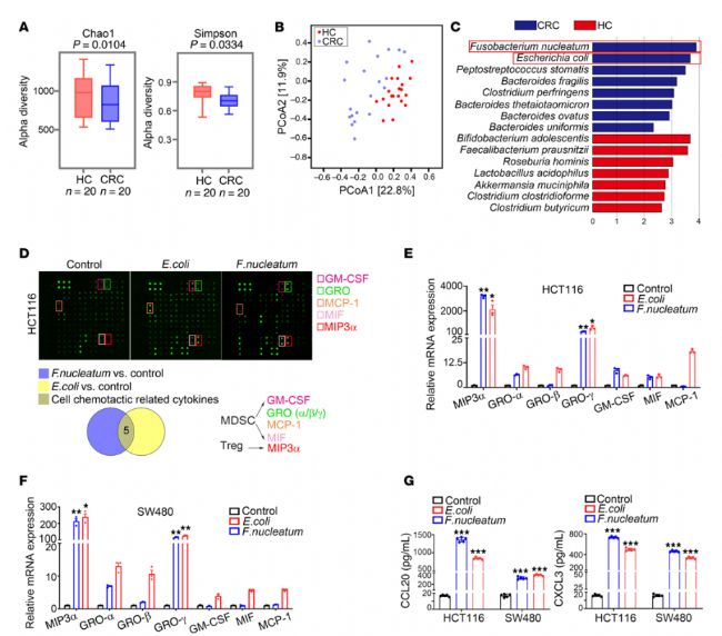 圖1:(A)采用 Chao1 指數(shù)和 Simpson 指數(shù)對(duì)結(jié)直腸癌組(CRC 組,n=20)和健康對(duì)照組(HC 組,n=20)進(jìn)行α多樣性分析。(B)在物種水平上對(duì)結(jié)直腸癌組(n=20)和健康對(duì)照組(n=20)進(jìn)行主坐標(biāo)分析(Principal Coordinate Analysis,PCoA)。(C)采用線(xiàn)性判別分析效應(yīng)量法(discriminant analysis effect size,LEfSe)篩選結(jié)直腸癌組(n=20)與健康對(duì)照組(n=20)間的標(biāo)志物種。藍(lán)色柱形和紅色柱形分別代表在結(jié)直腸癌組和健康對(duì)照組中富集的菌群標(biāo)志物種。(D)采用人細(xì)胞因子抗體芯片檢測(cè)經(jīng)具核梭桿菌或大腸桿菌處理后的 HCT116 細(xì)胞條件培養(yǎng)基(CM)中炎癥因子的變化情況。方框內(nèi)顯示的是與免疫細(xì)胞趨化相關(guān)的差異細(xì)胞因子,方框下方為細(xì)胞因子芯片韋恩圖。(E、F)實(shí)時(shí)熒光定量聚合酶鏈反應(yīng)(qPCR)分析顯示,結(jié)直腸癌細(xì)胞與具核梭桿菌、大腸桿菌共培養(yǎng) 6 小時(shí)后,細(xì)胞因子表達(dá)發(fā)生變化(n=3)。(G)酶聯(lián)免疫吸附試驗(yàn)(ELISA)檢測(cè)結(jié)直腸癌細(xì)胞與大腸桿菌、具核梭桿菌共培養(yǎng)后 CCL20 和 CXCL3 的分泌情況(n=5)。*P < 0.05,**P < 0.005,***P < 0.0005。