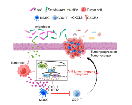 結(jié)論:作者揭示腸道微生物代謝產(chǎn)物4-HPA通過(guò)激活JAK2/STAT3信號(hào)通路,促進(jìn)結(jié)直腸癌細(xì)胞分泌趨化因子CXCL3,從而招募免疫抑制性的多形核髓源性抑制細(xì)胞(PMN-MDSCs),抑制CD8T細(xì)胞的抗腫瘤活性,最終促進(jìn)結(jié)直腸癌進(jìn)展及免疫抑制微環(huán)境的形成(如上圖2)。