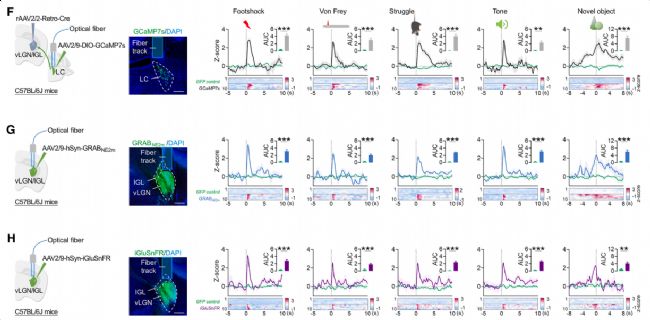 研究人員通過光纖鈣成像系統(tǒng)發(fā)現(xiàn)在足底電擊、氣噴、傷害性刺激、熱刺激、懸尾實驗等負(fù)性刺激vLGN/IGL神經(jīng)元鈣離子活性顯著增加。在聲音刺激、新物體刺激等中性刺激后上述神經(jīng)元鈣離子活性增加,但隨著刺激次數(shù)增加,鈣離子活性逐漸減弱。