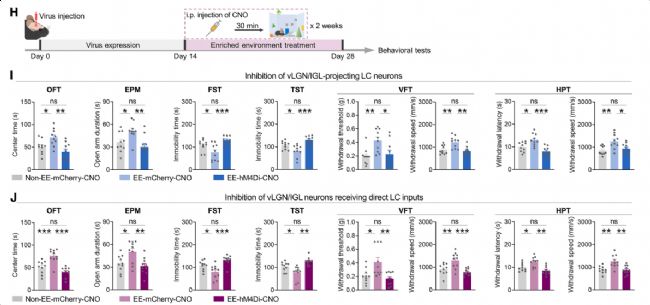 圖3、豐富環(huán)境刺激通過LC→vLGN/IGL環(huán)路發(fā)揮促應(yīng)激應(yīng)對行為作用