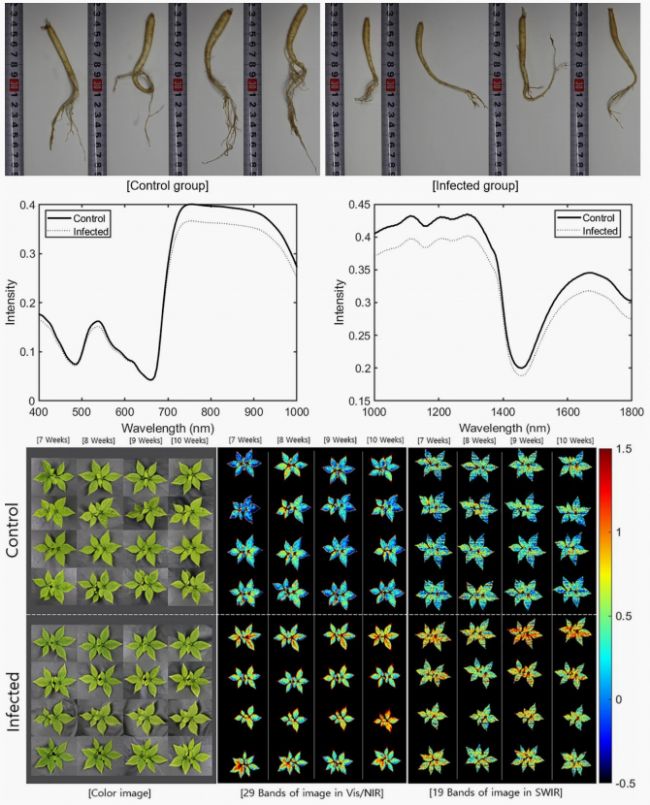 圖1 高光譜反射成像用于無損評估高麗參根腐。簭纳系较聻閷φ战M與根腐病感染組的根發(fā)育對比圖;兩組在可見-近紅外和短波紅外的平均光譜圖;兩組的彩色圖像和多光譜圖像(Vis/NIR和SWIR區(qū)域中主要波段的差異)