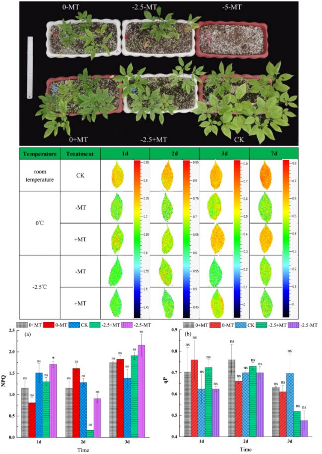 圖2 褪黑素對冷凍脅迫后人參葉表型和光合特性的影響(Deyue Su, etc. 2024):不同處理下人參幼苗生長情況;人參葉片的