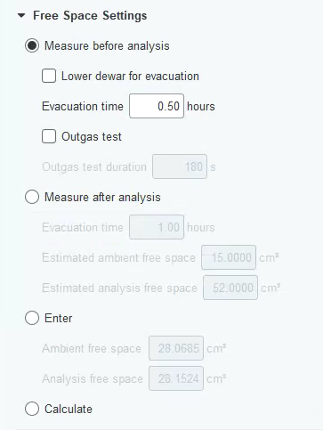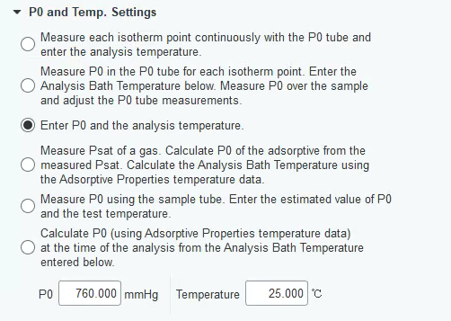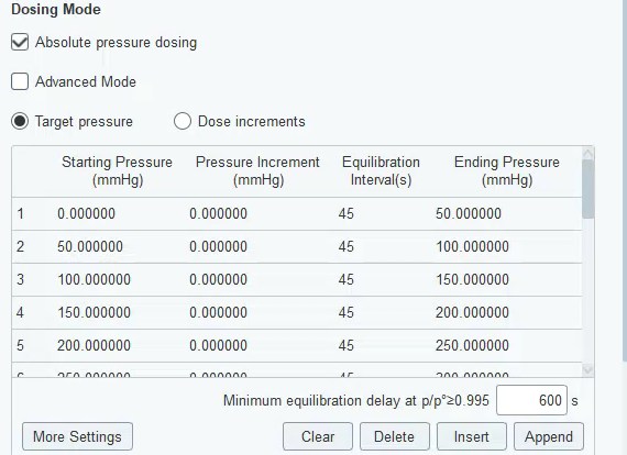 2.采用絕對壓力表,Dose increments 固定注氣方式。其中的注氣增量,根據(jù)樣品需要調(diào)整。低壓注氣方式為從零至第一個壓力點的遞增方式注氣, 關(guān)注微孔的吸附狀態(tài)。平衡時間選擇45秒或者30秒。