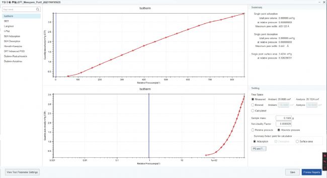 上圖為國儀量子微孔分析儀Sicope40設(shè)備Y分子篩標樣,CH4@25℃的測試報告,甲烷氣體的測試重點關(guān)注不同P/P0下的吸附量大小,該樣品在P/P0接近1的時候,吸附量為3.41cm3/g STP。