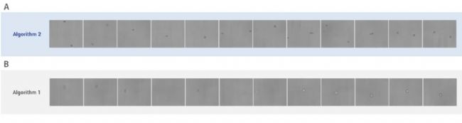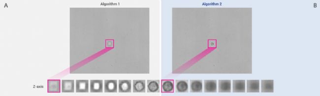 圖3. 將U937細(xì)胞稀釋至2.54 x 10⁴細(xì)胞/mL的濃度,使每張圖像中目標(biāo)物體少于5個(gè)。顯示完整的12個(gè)視場(chǎng)。算法2能有效檢測(cè)和識(shí)別目標(biāo)物體(A),而算法1未能實(shí)現(xiàn)理想聚焦(B)