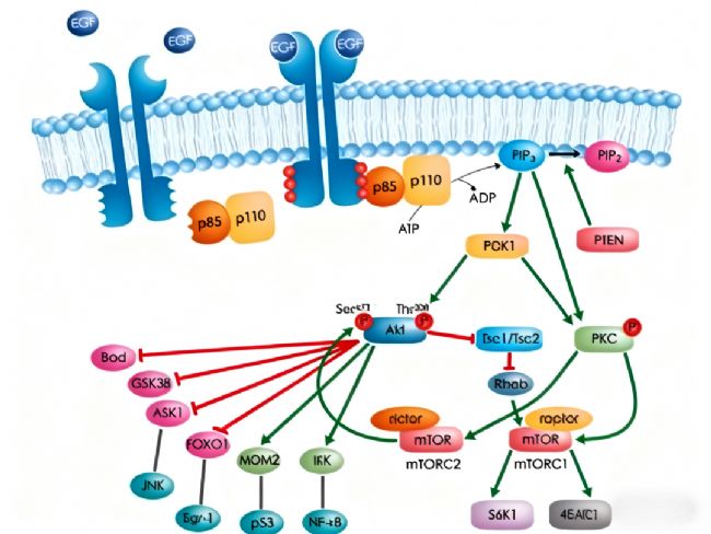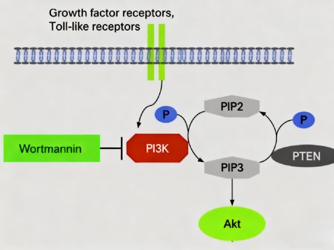 PI3K:即磷脂酰肌醇3-激酶,通常為由調(diào)節(jié)亞基p85和催化亞基p110構(gòu)成的異源二聚體。其激活可將細(xì)胞膜上的磷脂酰肌醇二磷酸轉(zhuǎn)化為第二信使——磷脂酰肌醇三磷酸,從而啟動下游信號級聯(lián)反應(yīng)。