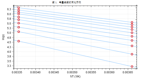 本質(zhì)上,等量吸附熱是通過在恒定吸附量(覆蓋度θ)下繪制ln(P)對1/T的曲線(即等量線,isostere)來確定的。每條等量線的斜率可用于計算該吸附量對應(yīng)的吸附熱。例如,下圖1展示了一個簡化的等量線圖,基于兩種溫度(由兩組垂直紅色圓圈標(biāo)示)和十處吸附體積(量)生成的等溫線繪制而成,因此可得到十個吸附熱值(每個吸附量對應(yīng)一個)。