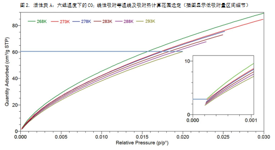 圖2展示了活性炭A在六個溫度下的吸附等溫線,并標(biāo)注了用于吸附熱計算的吸附量上下限(淺藍(lán)色標(biāo)線)
