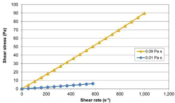 低濃度(1%)Aerosil® 200V甘油分散體(粘度0.01及0.09 Pa·s)的流變行為與純?nèi)軇┮恢,均表現(xiàn)為牛頓流體,表明低固含量下顆粒未形成空間網(wǎng)絡(luò)結(jié)構(gòu)。