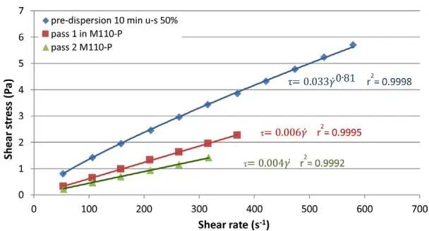 15%氣相二氧化硅在水中的預(yù)分散體以及使用微射流處理過(guò)程中的流動(dòng)曲線。