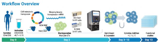 這正是這份應(yīng)用報(bào)告中,來(lái)自納瓦拉大學(xué)的研究者們所展示的核心價(jià)值。他們使用的 MaxCyte GTx™ 流式電轉(zhuǎn)染平臺(tái),完美解決了這個(gè)“一步投遞”的難題。它用一種非病毒的方式,在一次電擊操作中,同時(shí)將兩種CRISPR RNP、睡美人轉(zhuǎn)座酶mRNA和CD33-CAR轉(zhuǎn)座子minicircle DNA這四種功能各異的生物大分子,成功導(dǎo)入T細(xì)胞。