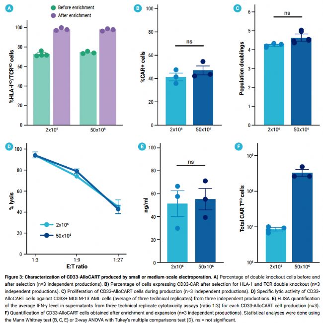 • 簡(jiǎn)單高效: 整個(gè)基因工程的核心步驟被簡(jiǎn)化為一次電轉(zhuǎn),大大縮短了制備時(shí)間。數(shù)據(jù)顯示,經(jīng)過(guò)改造,平均能獲得32.4%的CD33-CAR陽(yáng)性細(xì)胞,超過(guò)69%的細(xì)胞成功實(shí)現(xiàn)了雙基因敲除。