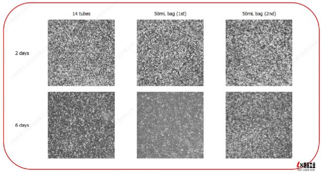 結(jié)論:50mL袋裝細(xì)胞的貼壁情況與14個(gè)凍存管的細(xì)胞相當(dāng)。