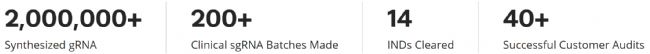 Synthego提供的GMP級(jí)gRNA與核酸酶產(chǎn)品嚴(yán)格遵循GMP標(biāo)準(zhǔn)進(jìn)行開發(fā),專為滿足IND申報(bào)以及臨床應(yīng)用所要求的高精度標(biāo)準(zhǔn)而設(shè)計(jì)。客戶可依托Synthego先進(jìn)的生產(chǎn)平臺(tái),確保其研發(fā)流程符合全球最嚴(yán)格的監(jiān)管規(guī)范。截至目前,Synthego已成功支持超過12項(xiàng)CRISPR基因編輯療法的IND申報(bào),在行業(yè)內(nèi)建立了高度可信的品牌聲譽(yù)。其持續(xù)穩(wěn)定的GMP級(jí)產(chǎn)品供應(yīng)能力,充分體現(xiàn)了Synthego致力于推動(dòng)以臨床療效為導(dǎo)向的基因編輯技術(shù)革新的長(zhǎng)期承諾。