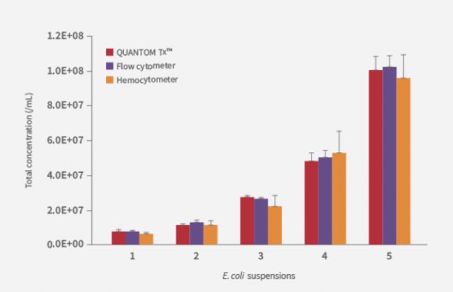 同時(shí)也與血球計(jì)數(shù)板和流式細(xì)胞分析儀進(jìn)行了實(shí)驗(yàn)對(duì)比,研究表明隨著細(xì)胞濃度的增加,傳統(tǒng)血細(xì)胞計(jì)數(shù)板的計(jì)數(shù)差異更為顯著。而點(diǎn)成QUANTOM Tx™微生物細(xì)胞計(jì)數(shù)儀和流式細(xì)胞分析儀的計(jì)數(shù)結(jié)果則更加一致,具有更好的可靠性和準(zhǔn)確性。