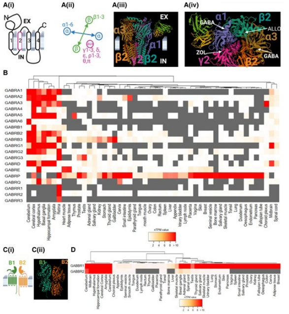 系統(tǒng)檢索跨物種(人、小鼠、大鼠)BGM 軸研究文獻,覆蓋神經(jīng)科學、微生物學、免疫學等領域;利用 Protein Atlas 等轉(zhuǎn)錄組數(shù)據(jù)庫,分析人類腦與腸道中 GABA_A 受體(GABA_AR)亞基的表達重疊性,識別腸道中功能關鍵但研究較少的亞基(如 ε、ρ 亞基)。