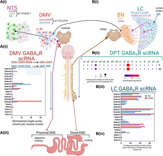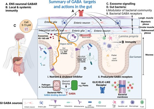 GABA 的雙向信號傳導路徑:BGM 軸中 GABA 信號呈 “自上而下” 與 “自下而上” 雙向傳遞。“自上而下” 路徑中,大腦通過 DMV、藍斑核(LC)、巴林頓核(BN)等核團調(diào)節(jié)腸道功能(如 DMV GABA_AR 激活抑制胃動力,圖 2A (i));“自下而上” 路徑中,腸道神經(jīng)元、免疫細胞、微生物產(chǎn)生的 GABA,通過迷走神經(jīng)傳入、免疫介質(zhì)擴散、外泌體運輸影響腦功能(如腸道 GABA 激活迷走神經(jīng)末梢受體,圖 5A)。
