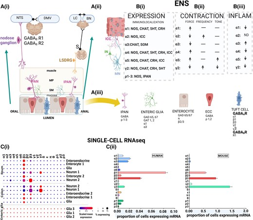 腸道中 GABA 的功能:腸道 GABA 由腸神經(jīng)元、腸膠質(zhì)細胞、腸內(nèi)分泌細胞(如腸嗜鉻細胞)及微生物產(chǎn)生,通過 ENS 調(diào)節(jié)腸道功能(圖 3A (iii)):含 ρ 亞基的 GABA_AR 調(diào)節(jié)小鼠回腸慢抑制電位,α3-GABA_AR 參與壓力誘導的結(jié)腸炎癥(圖 3B (ii)(iii));GABA 還可激活腸嗜鉻細胞受體,促進 5 - 羥色胺釋放,間接傳遞腸道感覺信號。