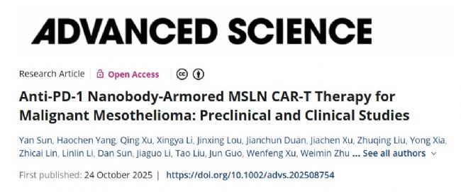Y. Sun, H. Yang, Q. Xu, et al. “ Anti-PD-1 Nanobody-Armored MSLN CAR-T Therapy for Malignant Mesothelioma: Preclinical and Clinical Studies.” Adv. Sci. (2025): e08754. https://doi.org/10.1002/advs.202508754
