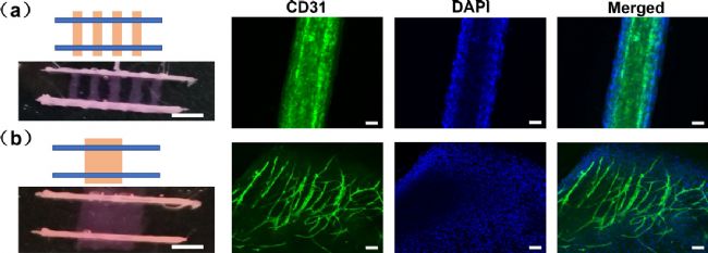 圖1 不同纖維蛋白條帶的3D生物打印結(jié)構(gòu)中血管分支的形成。(a)生物打印構(gòu)建,細(xì)胞纖維蛋白條寬1.2毫米,長(zhǎng)6毫米,培養(yǎng)14天后形成血管。(b)具有7.2 mm寬和6mm長(zhǎng)的細(xì)胞纖維蛋白條的生物打印構(gòu)建體,培養(yǎng)14天后血管形成。CD31,綠色;DA中VI,藍(lán)色。比例尺,分別為5 mm和50um