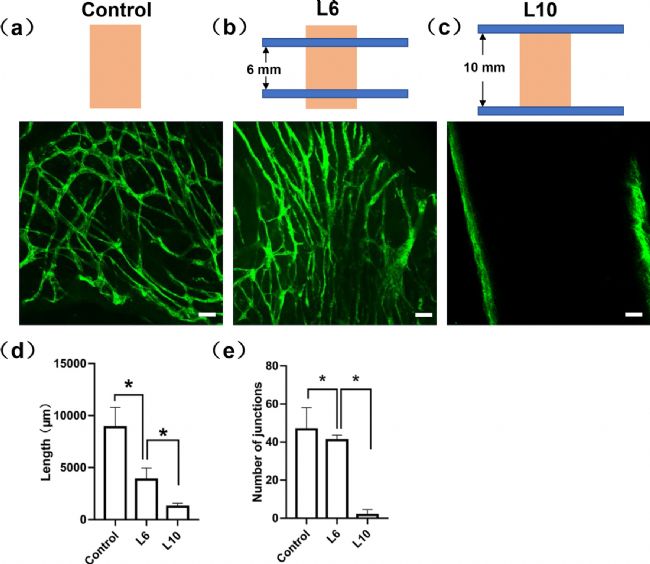 圖2:不同R寸PCL框架的3D生物打印組織中血管分支的形成。(3)控制組(無(wú)PCL框架):(b)L6組(長(zhǎng)度為6毫米的PCL框架):(c)L10組(長(zhǎng)度的PCL框架)。三組生物印跡組織的大小相同?潭劝,50微米。構(gòu)造物中(d)血管長(zhǎng)度和(e)分支的定量化。
