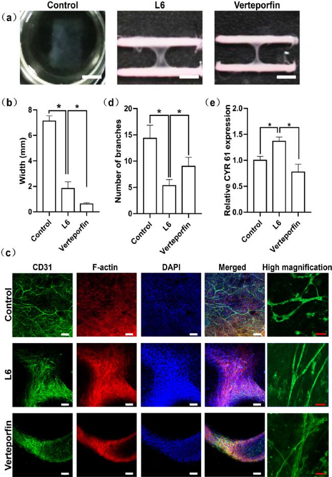 圖3:YAP抑制劑影響的血管網(wǎng)絡(luò)組裝。(a)培養(yǎng)14天后用Verteporfin處理的不同構(gòu)造的寬度;鱗片條,5毫米。(6)文化活動(dòng)14天后的團(tuán)體寬度。(c)培養(yǎng)14天后染色CD31和F-肌動(dòng)蛋白:白鱗片,100微米,紅鱗片,50微米。(d)構(gòu)架中的分支。(e)培養(yǎng)6小時(shí)后,用qPCR檢測(cè)對(duì)照組、L6組和維替泊芬組組織中CYR61的表達(dá)。