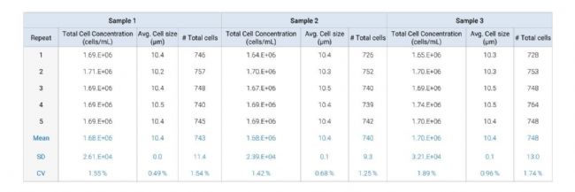 如表1所示,所有檢測(cè)結(jié)果均保持良好一致性,總細(xì)胞濃度、平均細(xì)胞尺寸及總細(xì)胞數(shù)量等參數(shù)高度吻合。細(xì)微的變動(dòng)(CV值約為1%)可能源于在使用設(shè)備進(jìn)行重復(fù)細(xì)胞計(jì)數(shù)時(shí)重新插入LUNA細(xì)胞計(jì)數(shù)載玻片造成的。