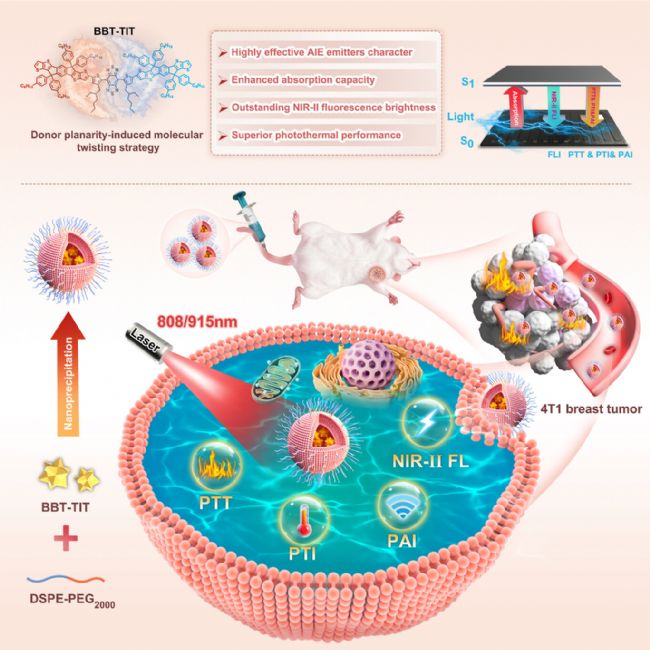 本研究成功合成了三種具有聚集誘導發(fā)光活性的近紅外二區(qū)發(fā)射D-A-D小分子(BBT-IT、BBT-DID和BBT-TIT),其通過將不同π共軛平面電子供體(IT、DID、TIT)與電子受體BBT偶聯(lián)構建而成。該分子設計策略可實現(xiàn)關鍵光物理性質的精準調控:平面供體的選擇影響HOMO-LUMO能隙,從而調節(jié)吸收波長并顯著影響摩爾消光系數(shù)。其中,BBT-TIT在制備成納米顆粒后展現(xiàn)出特別優(yōu)越的綜合性能,包括高摩爾消光系數(shù)(ɛ = 2.352 × 10⁴ M⁻¹ cm⁻¹)、顯著的AIE行為(αAIE = 4.5)、水中顯著的近紅外二區(qū)熒光發(fā)射(量子產(chǎn)率=1.85%)以及高效的光熱轉換效率(η=53.44%)。憑借這些優(yōu)異的光熱特性,BBT-TIT NPs在915 nm激光照射下對4T1癌細胞產(chǎn)生強效體外細胞毒性,在荷瘤小鼠體內實驗中實現(xiàn)血管與腫瘤組織的高對比度近紅外二區(qū)熒光/光聲雙模態(tài)成像,并在光熱治療后實現(xiàn)有效的腫瘤消融。這項工作表明,在適當扭曲的D-A-D分子結構中整合經(jīng)過精選的平面電子供體,對于開發(fā)近紅外二區(qū)熒光成像與光熱治療聯(lián)用的高性能試劑具有顯著效果,為合理設計下一代光熱診療材料提供了重要參考。