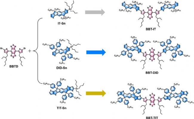 盡管許多已報道的具有D-A-D結構的近紅外二區(qū)聚集誘導發(fā)光(AIE)熒光團采用扭曲構象(通常以TPA或TPE類似物作為電子供體來限制聚集態(tài)下的分子內旋轉),但如何同時優(yōu)化這些體系的強AIE效應和理想光物理特性(如吸收波長、摩爾消光系數(shù)、光熱轉換效率)仍是研究熱點。常見問題在于,傳統(tǒng)扭曲供體可能導致近紅外二區(qū)應用的吸收特性欠佳。本研究探索了一種通過優(yōu)化π共軛電子供體來提升近紅外二區(qū)AIE熒光團性能的策略。如方案2所示,本文將三種具有相對平面共軛結構的電子供體——IT、DID和TIT與已知能誘導骨架扭曲的核心受體(BBTD)偶聯(lián)。假設這種平面供體與扭曲D-A-D框架的整合,可在保留受體核心賦予的構象扭曲(呈現(xiàn)AIE特性)的同時,發(fā)揮供體的電子特性優(yōu)勢。通過取代反應先將供體化合物(IT、DID、TIT)轉化為相應的錫烷中間體(IT-Sn、DID-Sn、TIT-Sn),再與受體BBTD進行鈀催化Stille偶聯(lián)反應,最終獲得目標化合物(BBT-TIT、BBT-DID、BBT-IT)。