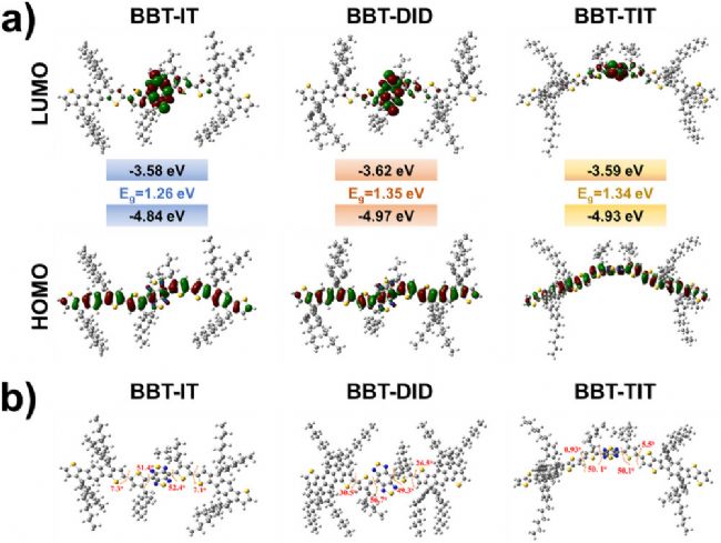 通過密度泛函理論(DFT)計算分析了BBT-IT、BBT-DID和BBT-TIT的電子結構與分子幾何構型。如圖1所示,三者最高占據(jù)分子軌道(HOMO)主要分布在整個共軛骨架上,而最低未占分子軌道(LUMO)則集中在缺電子受體單元上。計算得到的HOMO-LUMO能隙分別為:BBT-IT 1.26 eV、BBT-DID 1.35 eV、BBT-TIT 1.34 eV,這些較小的能隙表明其具有顯著的分子內電荷轉移(ICT)特性和近紅外二區(qū)發(fā)射潛力。其中BBT-IT的能隙最小。優(yōu)化后的S0幾何構型顯示,三個分子均呈現(xiàn)明顯扭曲構象:BBT核心(BBTD)與噻吩間隔基的二面角分別為BBT-IT 51.4°/52.4°、BBT-DID 56.7°/49.3°、BBT-TIT 50.1°/50.1°。這種扭曲共軛骨架有助于抑制聚集態(tài)下的強分子間π-π相互作用,從而提升近紅外二區(qū)熒光性能。此外,噻吩間隔基與各電子供體間的二面角分別為BBT-IT約7.3°/7.1°、BBT-DID 30.5°/26.5°、BBT-TIT 0.93°/5.5°,這些差異反映了IT、DID和TIT供體單元在連接位點產(chǎn)生的不同空間位阻與電子效應,盡管它們整體保持平面核心結構。