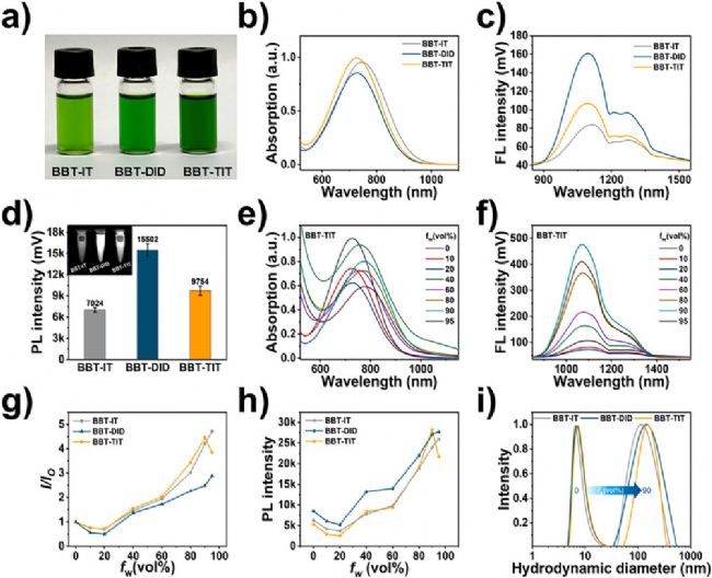 為評估BBT-IT、BBT-DID與BBT-TIT在四氫呋喃(THF)中的物理化學性質,研究者對它們進行了系統(tǒng)的光學表征。如圖2a所示,合成的熒光團在有機溶劑THF中均展現(xiàn)出良好溶解性,形成均勻的綠色溶液。這些AIE型D-A-D小分子在THF中的吸收光譜顯示(圖2b):BBT-IT、BBT-DID與BBT-TIT的主要吸收峰分別位于745 nm、731 nm和732 nm。其中,BBT-IT由于具有最小的計算HOMO-LUMO能隙(ΔE = 1.26 eV,圖1a),表現(xiàn)出最顯著的紅移吸收特征。通過測定最大吸收波長處的摩爾消光系數(shù)(ɛ),發(fā)現(xiàn)三者數(shù)值分別為:BBT-IT 1.320×10⁴ M⁻¹ cm⁻¹、BBT-DID 1.665×10⁴ M⁻¹ cm⁻¹、BBT-TIT 2.353×10⁴ M⁻¹ cm⁻¹。BBT-TIT顯著更高的ɛ值表明,相較于IT和DID供體結構,TIT供體的結構特征特別有利于增強近紅外二區(qū)熒光團的光捕獲能力。熒光發(fā)射光譜表明(圖2c):所有三種熒光團在THF中的發(fā)射譜帶均延伸至近紅外二區(qū),尾端可達1500 nm。值得注意的是,在稀釋的THF溶液中,BBT-DID在最大發(fā)射峰(約1100 nm)附近的熒光強度最高,分別達到BBT-IT的1.5倍和BBT-TIT的2.1倍(圖2d)。這說明在DID電子供體側鏈引入己基苯基,能有效增強溶解狀態(tài)下的輻射衰減途徑。