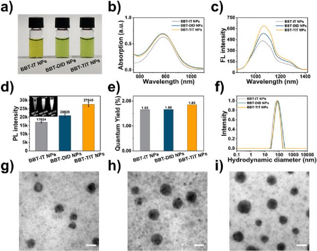 為評估這些熒光團在生物應用相關的含水環(huán)境中的性質,并進一步研究它們在聚集狀態(tài)下的行為,研究者采用納米沉淀法制備了水溶性納米顆粒。通過使用兩親性共聚物DSPE-PEG2000作為基質,分別封裝了BBT-IT、BBT-DID與BBT-TIT三種分子,最終獲得的納米顆粒分散液(分別為BBT-IT NPs、BBT-DID NPs和BBT-TIT NPs)均呈均質狀態(tài),外觀為綠色溶液(圖3a)。與相應的THF溶液相比,納米顆粒的吸收光譜出現(xiàn)輕微紅移:BBT-IT NPs、BBT-DID NPs與BBT-TIT NPs的最大吸收峰分別位于779 nm、777 nm和778 nm(圖3b)。這些納米顆粒的近紅外二區(qū)熒光光譜均覆蓋近紅外二區(qū)窗口,發(fā)射峰位于1060 nm附近(圖3c),表明它們適用于活體近紅外二區(qū)熒光成像。通過分析相同濃度下分散液的熒光成像(圖3d),發(fā)現(xiàn)BBT-TIT NPs產(chǎn)生的圖像亮度最高,其信號強度分別約為BBT-IT NPs和BBT-DID NPs的1.6倍和1.3倍。以二氯乙烷中的IR-26(量子產(chǎn)率0.5%)作為參考標準,測得水相中納米顆粒的光致發(fā)光量子產(chǎn)率(QY)分別為:BBT-IT NPs 1.65%、BBT-DID NPs 1.66%、以及BBT-TIT NPs 1.85%(圖3e)。這些結果表明,在納米顆粒劑型中,BBT-TIT NPs展現(xiàn)出最明亮的近紅外二區(qū)發(fā)射和最高的量子產(chǎn)率。動態(tài)光散射(DLS)測量顯示,制備的納米顆粒流體動力學直徑分別為:BBT-IT NPs 67.28 nm、BBT-DID NPs 80.14 nm和BBT-TIT NPs 75.14 nm(圖3f)。透射電子顯微鏡圖像顯示出相對均勻的球形形態(tài),三種納米顆粒的平均直徑基本分布在60-120 nm范圍內(圖3g-i)。此外,這些納米顆粒在PBS溶液中儲存15天后,尺寸未發(fā)生顯著變化,表明其具有良好的膠體穩(wěn)定性。