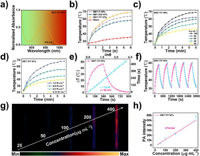 鑒于它們在近紅外二區(qū)具有優(yōu)異的吸收特性,研究者進一步研究了這些納米顆粒在水溶液中被915 nm激光照射時的光熱性能(圖4a)。以純水為對照,含BBT-IT NPs、BBT-DID NPs和BBT-TIT NPs(0.1 mg mL⁻¹)的溶液在照射6分鐘后,溫度分別升高至63.8℃、58.2℃和69.0℃(圖4b)。在不同納米顆粒濃度和激光功率密度下記錄的溫度變化曲線證實了光熱效應與濃度和功率密度之間的正相關性(圖4c,d)。基于冷卻曲線計算得到BBT-IT NPs的光熱轉換效率為63.95%,BBT-DID NPs為48.75%,BBT-TIT NPs為53.44%(圖4e)。值得注意的是,BBT-TIT NPs表現(xiàn)出出色的光熱穩(wěn)定性,在五次激光開關循環(huán)后,達到的最高溫度變化可忽略不計(圖4f)。本文還評估了先導候選材料BBT-TIT NPs用于光聲成像的潛力。它們能夠產(chǎn)生強烈的近紅外二區(qū)光聲信號,且表現(xiàn)出優(yōu)異的濃度依賴性(圖4g,h),表明其適合作為近紅外二區(qū)光聲成像的對比劑。在這三種材料中,BBT-TIT NPs展現(xiàn)出最具優(yōu)勢的性能,包括其在納米顆粒狀態(tài)下的最高量子產(chǎn)率、光照下的顯著升溫、良好的光熱穩(wěn)定性以及有效的光聲信號產(chǎn)生能力。這些特性使得BBT-TIT NPs成為后續(xù)活體成像與治療研究中極具前景的多功能制劑。