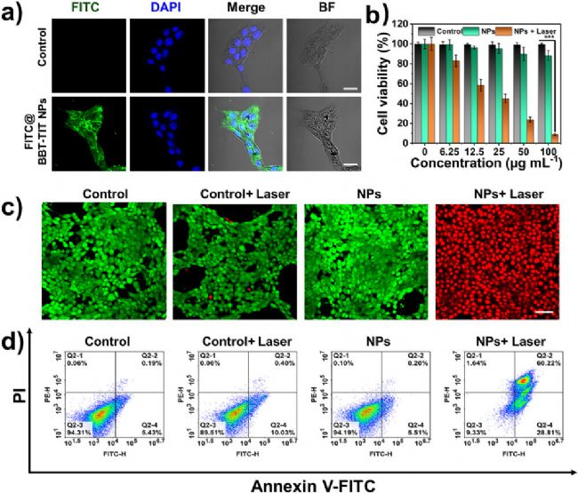 為評估BBT-TIT納米顆粒的體外抗腫瘤效果,本文采用4T1小鼠乳腺癌細胞系進行了實驗。為通過共聚焦激光掃描顯微鏡觀察細胞攝取情況,采用納米沉淀法將熒光染料異硫氰酸熒光素(FITC)與BBT-TIT共同封裝在DSPE-PEG2000基質中制備納米顆粒。如圖5a所示,在4小時孵育后,4T1細胞質內可觀察到與FITC相對應的亮綠色熒光,這表明納米顆粒具有有效的內化能力。接著通過標準MTT法評估了BBT-TIT納米顆粒的細胞毒性。在沒有激光照射的情況下(圖5b),即使在100 µg mL−1濃度下,細胞存活率仍保持較高水平(≈96%)。該結果表明納米顆粒本身具有良好的生物相容性。然而當使用915 nm激光(1.0 W cm⁻²,持續(xù)6分鐘)照射時,觀察到顯著的劑量依賴性光毒性:細胞存活率隨納米顆粒濃度增加而急劇下降,在100 µg mL−1時降至約9.1%(圖5b),證明了BBT-TIT納米顆粒在體外具有強效的光熱治療作用。