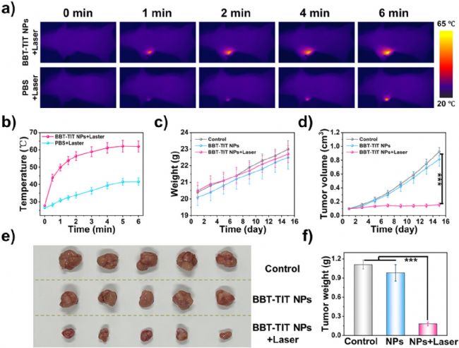 接著通過近紅外二區(qū)熒光/光聲雙模態(tài)成像引導評估了其體內抗腫瘤療效。在靜脈注射BBT-TITNPs 12小時后,對荷4T1腫瘤小鼠的腫瘤區(qū)域進行915 nm激光(1.0 W cm⁻²,6分鐘)照射。實時溫度監(jiān)測顯示,經(jīng)BBT-TIT NPs處理的組別腫瘤區(qū)域溫度在6分鐘內從約29°C迅速升至63°C(圖7a,b),證明該納米顆粒在體內具有高效光熱轉換能力;而在相同照射條件下,注射PBS的對照組僅出現(xiàn)輕微溫升(≈10°C)。為評估長期療效,將荷瘤小鼠隨機分為三組:(1)對照組(注射PBS);(2)僅納米顆粒組(注射BBT-TIT NPs但不照激光);(3)納米顆粒+激光組(注射后12小時進行激光照射)。每兩日監(jiān)測腫瘤體積與小鼠體重,持續(xù)15天。治療期間三組小鼠體重均無顯著差異,表明其系統(tǒng)毒性較低(圖7c)。對照組與僅納米顆粒組的腫瘤生長趨勢相似且持續(xù)進展,但納米顆粒+激光組的腫瘤生長在整個觀察期間均受到顯著抑制(圖7d),展現(xiàn)出強效的光熱治療作用。在研究第15天處死小鼠并切除腫瘤稱重,光熱治療組明顯更小的腫瘤重量進一步證實了治療效果(圖7e,f)。