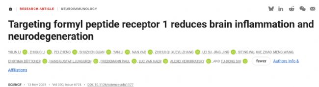 2025年11月13日,天津醫(yī)科大學(xué)總醫(yī)院/北京天壇醫(yī)院施福東教授課題組在Science期刊上發(fā)表了題名為“Targeting formyl peptide receptor 1 reduces brain inflammation and neurodegeneration”的研究論文,揭示了甲酰肽受體1(FPR1)在推動(dòng)多發(fā)性硬化(MS)神經(jīng)炎癥與神經(jīng)退行中的核心機(jī)制。