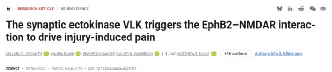 2025年11月20日,美國學(xué)者在Science期刊上發(fā)表了題名為“The synaptic ectokinase VLK triggers the EphB2–NMDAR interaction to drive injury-induced pain”的研究論文,研究揭示了細(xì)胞外磷酸化在調(diào)控突觸信號(hào)傳導(dǎo)與疼痛行為中的新機(jī)制。