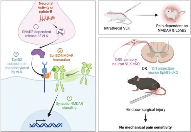 研究發(fā)現(xiàn)分泌型胞外激酶VLK能特異性磷酸化EphB2受體酪氨酸Y504位點(diǎn),從而誘導(dǎo)EphB2與NMDA受體結(jié)合。VLK定位于突觸小泡,在神經(jīng)元活動(dòng)增強(qiáng)時(shí)通過SNARE依賴方式釋放至突觸間隙。在疼痛模型中,感覺神經(jīng)元釋放的VLK通過激活脊髓背角投射神經(jīng)元中的EphB2-NMDAR信號(hào)通路,介導(dǎo)機(jī)械性痛覺超敏的形成。實(shí)驗(yàn)證實(shí),特異性敲除感覺神經(jīng)元中的VLK或投射神經(jīng)元中的EphB2均能阻斷損傷性疼痛行為,而鞘內(nèi)注射重組VLK則足以誘發(fā)疼痛樣行為。