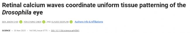 2025年11月20日,美國學(xué)者在Science期刊上發(fā)表了題名為“Retinal calcium waves coordinate uniform tissue patterning of the Drosophila eye”的研究論文,研究揭示了果蠅復(fù)眼發(fā)育過程中非神經(jīng)元鈣波調(diào)控組織有序化的新機(jī)制。