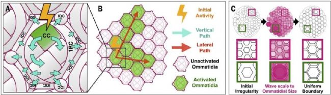 通過新型干透鏡成像技術(shù),研究發(fā)現(xiàn)鈣波由單個(gè)小眼內(nèi)錐形細(xì)胞通過Cad96Ca受體激活PLC-γ/IP3R信號(hào)通路觸發(fā)內(nèi)質(zhì)網(wǎng)鈣釋放。鈣信號(hào)通過細(xì)胞類型特異性的innexin蛋白間隙連接通道,縱向傳播至小眼內(nèi)所有視網(wǎng)膜細(xì)胞(光感受器除外),橫向擴(kuò)散至相鄰小眼形成跨區(qū)域鈣波。這些鈣波驅(qū)動(dòng)肌球蛋白II介導(dǎo)的頂端收縮,其信號(hào)強(qiáng)度與小眼尺寸成正比,促使前腹側(cè)較大小眼產(chǎn)生更強(qiáng)收縮力,最終消除早期邊界差異,形成均勻有序的視網(wǎng)膜陣列。該機(jī)制通過調(diào)整背側(cè)小眼和腹側(cè)小眼的形態(tài)差異,可能滿足其對(duì)天空與地面視覺需求的適應(yīng)性。