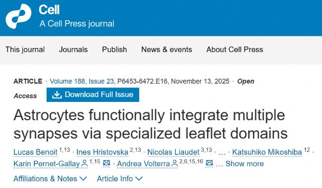 2025年11月13日,法國、瑞士、意大利、德國、日本以及中國學(xué)者聯(lián)合在Cell期刊上發(fā)表了題名為“Astrocytes functionally integrate multiple synapses via specialized leaflet domains”的研究論文,揭示了星形膠質(zhì)細(xì)胞葉片狀結(jié)構(gòu)在整合突觸信號(hào)中的新機(jī)制。