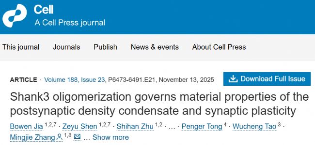 2025年11月13日,南方科技大學(xué)張明杰院士課題組在Cell期刊上發(fā)表了題名為“Shank3 oligomerization governs material properties of the postsynaptic density condensate and synaptic plasticity”的研究論文,揭示了突觸后密度(PSD)生物凝聚體的材料特性及其在突觸功能中的關(guān)鍵作用。