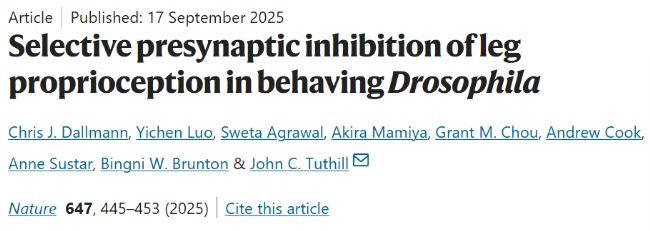 2025年9月17日,美國學(xué)者在Nature期刊上發(fā)表了題名為“Selective presynaptic inhibition of leg proprioception in behaving Drosophila”的研究論文,揭示了果蠅自發(fā)運(yùn)動(dòng)過程中特異性抑制本體感覺信號(hào)的神經(jīng)環(huán)路機(jī)制。
