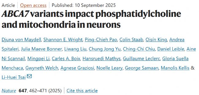 2025年9月10日,美國以及意大利學(xué)者聯(lián)合在Nature期刊上發(fā)表了題名為“ABCA7 variants impact phosphatidylcholine and mitochondria in neurons”的研究論文,揭示了ABCA7功能缺失變異通過破壞磷脂酰膽堿代謝介導(dǎo)阿爾茨海默病風(fēng)險(xiǎn)的機(jī)制。