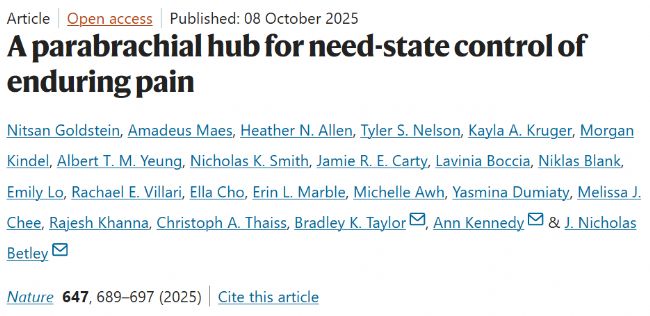 2025年10月8日,美國學(xué)者在Nature期刊上發(fā)表了題名為“A parabrachial hub for need-state control of enduring pain”的研究論文,揭示了臂旁核中表達(dá)Y1神經(jīng)肽受體的神經(jīng)元群體在持續(xù)性疼痛調(diào)控中的核心作用。