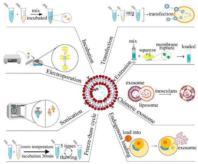 外源性載藥是將外泌體純化后,通過電穿孔、共孵育、超聲、化學(xué)轉(zhuǎn)染或反復(fù)凍融等方法將藥物裝載入外泌體中。這種方法的優(yōu)點是操作相對簡單直接,但可能會影響外泌體的完整性,并需要額外步驟去除未成功裝載的藥物。